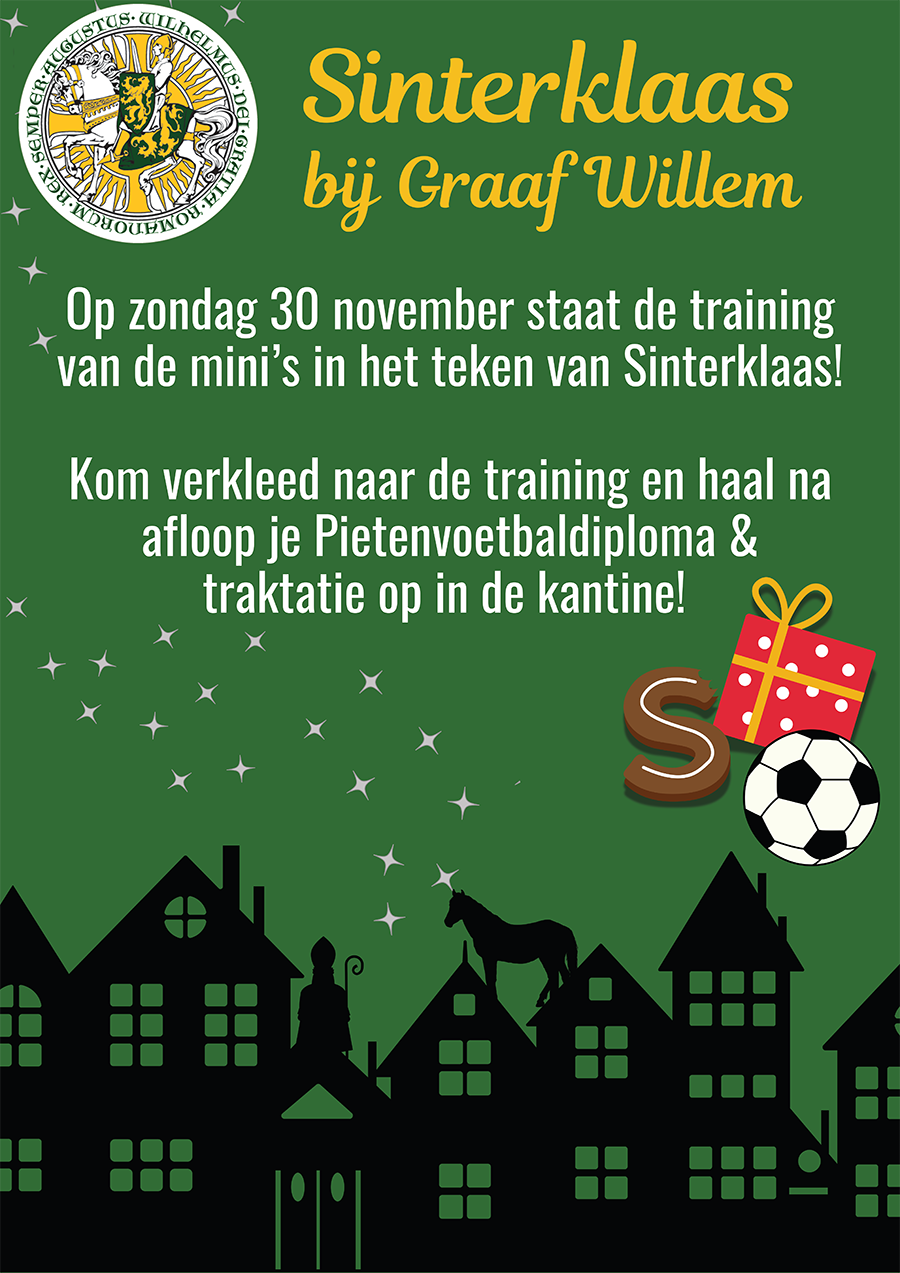 Op zondag 30 november staat de training van de mini’s in het teken van Sinterklaas! Kom verkleed naar de training en haal na afloop je Pietenvoetbaldiploma & traktatie op in de kantine.
